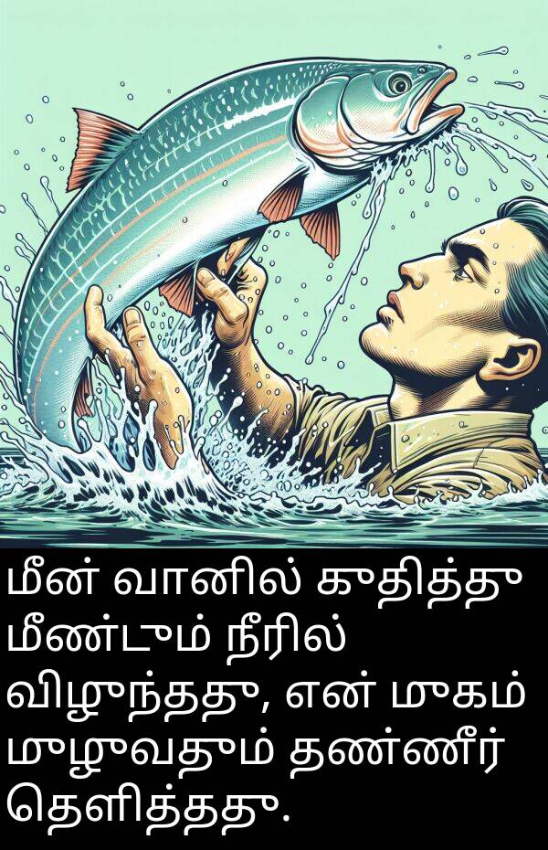 மீன் வானில் குதித்து மீண்டும் நீரில் விழுந்தது, என் முகம் முழுவதும் தண்ணீர் தெளித்தது.