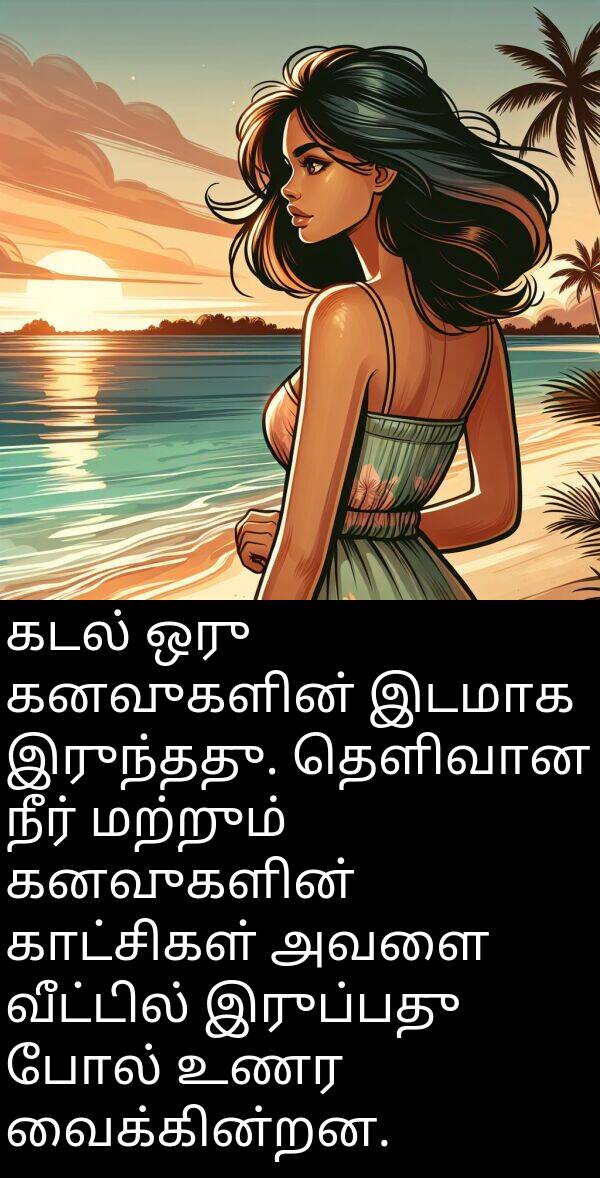 கடல் ஒரு கனவுகளின் இடமாக இருந்தது. தெளிவான நீர் மற்றும் கனவுகளின் காட்சிகள் அவளை வீட்டில் இருப்பது போல் உணர வைக்கின்றன.