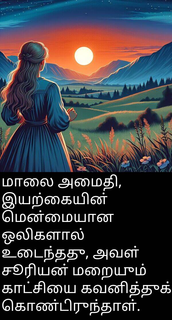 மாலை அமைதி, இயற்கையின் மென்மையான ஒலிகளால் உடைந்தது, அவள் சூரியன் மறையும் காட்சியை கவனித்துக் கொண்டிருந்தாள்.