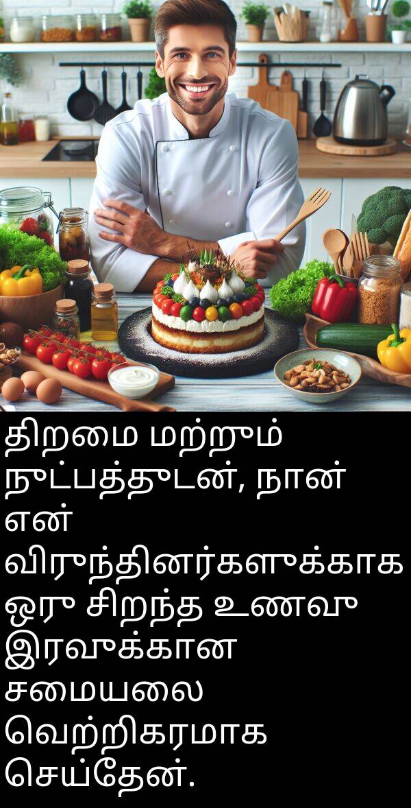 திறமை மற்றும் நுட்பத்துடன், நான் என் விருந்தினர்களுக்காக ஒரு சிறந்த உணவு இரவுக்கான சமையலை வெற்றிகரமாக செய்தேன்.